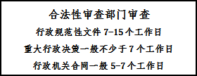 2.完善合法性审查流程。合法性审查应当保证必要时间,属于政府合同、行政规范性文件的,一般不少于7个工作日;属于重大行政决策的,一般不少5于个工作日;属于重大行政执法决定的,应当在5个工作日内及时审查完毕;其他涉法事项一般不少于3个工作日。对送审材料不齐全的,可要求提交审查机构在3个工作日内予以补齐,办理时限自补齐材料之日起计算,逾期不补齐的予以退回。因合法性审核需要召开会议、书面征求意见、实地调研、专家论证的时间不计入审核时限。
