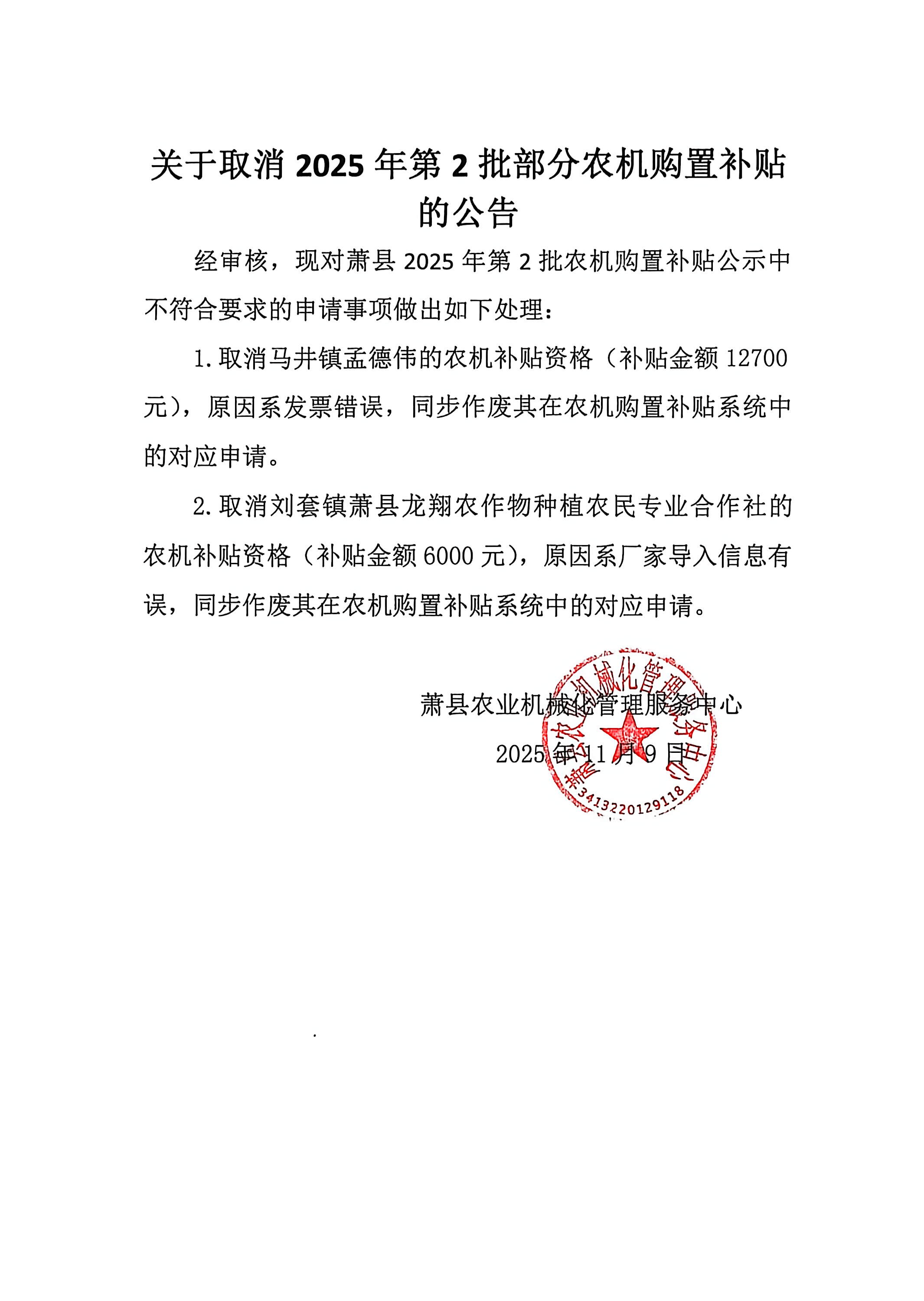 关于取消2025年第2批部分农机购置补贴的公告