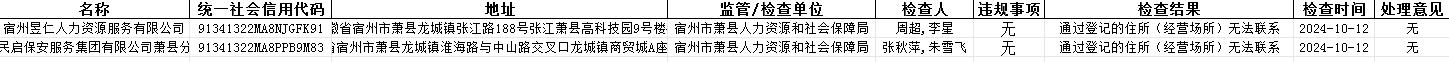 【抽查结果】萧县人力资源和社会保障局2024年度全县劳务派遣机构联合检查定向抽取计划执行情况“双随机、一公开”抽查(部分)