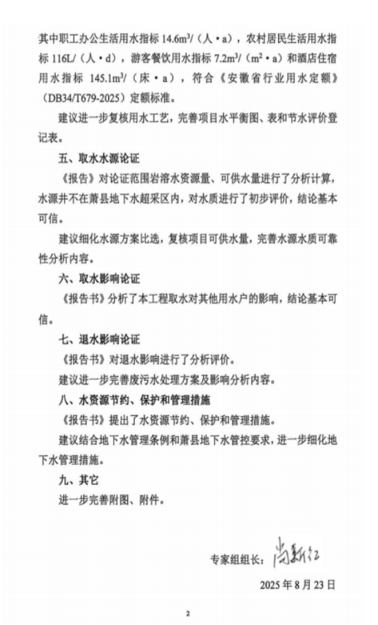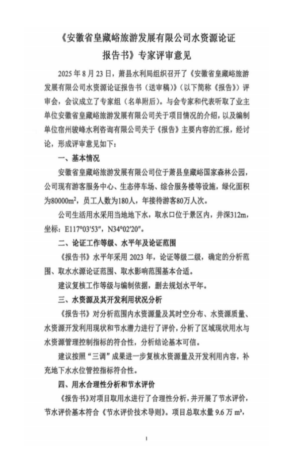 附件:安徽省皇藏峪旅游发展有限公司水资源论证报告书技术审查意见