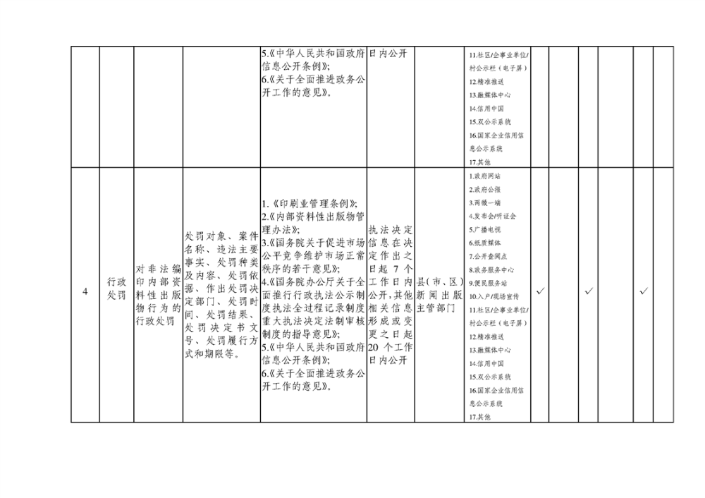 《新闻出版版权领域基层政务公开标准目录》公开事项包括行政许可、行政处罚两个一级事项,具体包括“出版物零售单位和个体工商户设立、变更审批”“对非法从事印刷经营活动的行政处罚”“对非法从事复制经营活动的行政处罚”“对非法编印内部资料性出版物行为的行政处罚”“对非法从事出版物发行活动的行政处罚”“对损害公共利益的有关著作权侵权行为作出行政处罚”“对违反《信息网络传播权保护条例》的有关行为作出行政处罚”等7个二级事项,并对公开内容(要素)、公开依据、公开时限、公开主体、公开渠道和载体、公开对象、公开方式和公开层级进行明确,提供了开展新闻出版版权领域基层政务公开工作的基础性标准框架。各级新闻出版版权部门可在此目录基础上,结合本地工作实际进行细化充实。